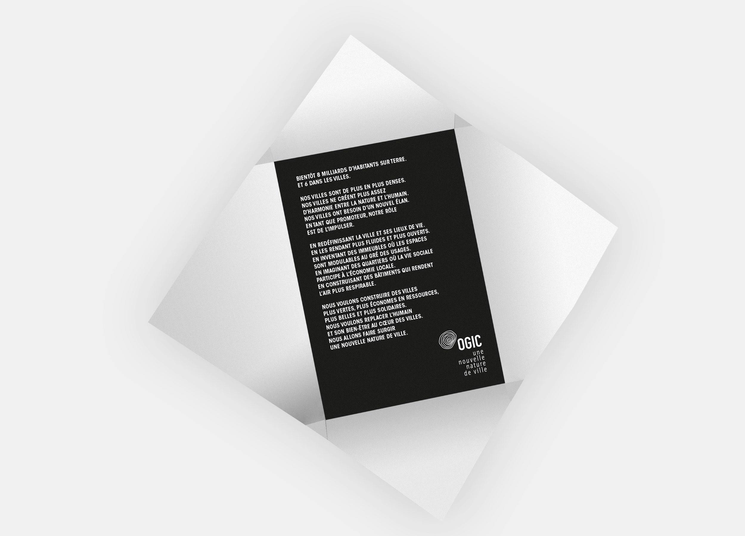 "Une nouvelle nature de ville". De la réécriture de la plateforme de marque est née cette signature. Elle a servi de ligne directrice pour le développement d'un territoire graphique que nous avons voulu aérer et épurer élégamment. Avec un symbole fort : un logotype fait de ronds concentriques, évoquant tant les coupes topographiques et l'empreinte que laisseront nos villes que les cernes de la réconciliation entre nature et architecture. Pour l'accompagner, une palette restreinte faite de noir et de blanc, pour marquer l'élégance et porter l'innovation. De quoi faire des projets l'élément central des communications, tout en faisant respirer le contenu. Car après tout, c'est bien en repensant les lumières, les surfaces et les espaces qu'OGIC sait faire respirer les villes.